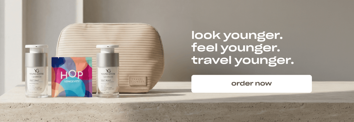 HOP Box: Quercetin, Fisetin, B-Glycoside Apigenin, CurcuPrime® (tetrahydrocurcumin), Astaxanthin, NewBiome® (tributyrin), GlucoVantage® (dihydroberberine), Vitamin D3, Vitamin K2-MK7, NR, Puremidine™ (spermidine), Ca AKG, Magnesium Glycinate, Hyaluronic Acid, Vitamin B2, Vitamin B6, Vitamin B12, Quatrefolic 5-MTHF, Trimethylglycine (TMG)