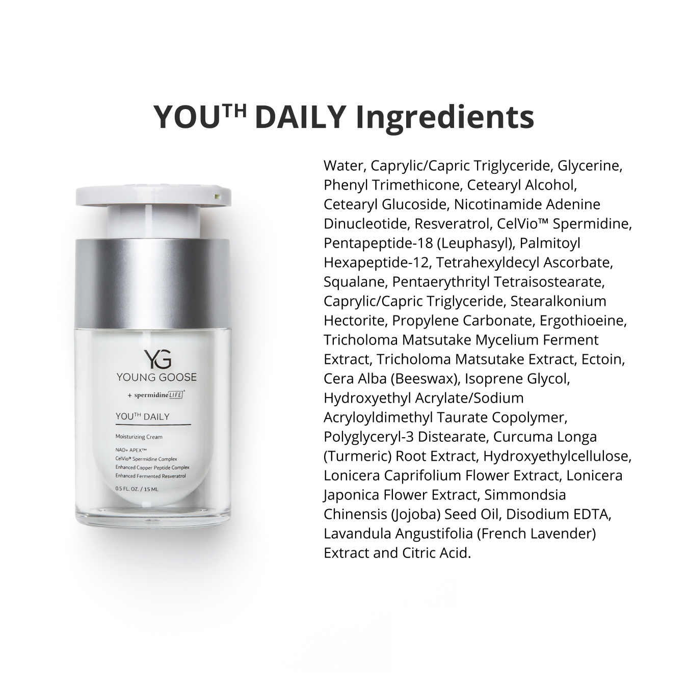 YOUTH DAILY: Water, Caprylic/Capric Triglyceride, Glycerine, Phenyl Trimethicone, Cetearyl Alcohol, Cetearyl Glucoside, Nicotinamide Adenine Dinucleotide, Resveratrol, CelVio™️ Spermidine, Pentapeptide-18 (Leuphasyl), Palmitoyl Hexapeptide-12, Tetrahexyldecyl Ascorbate, Squalane, Pentaerythrityl Tetraisostearate, Caprylic/Capric Triglyceride, Stearalkonium Hectorite, Propylene Carbonate, Ergothioeine, Tricholoma Matsutake Mycelium Ferment Extract, Tricholoma Matsutake Extract, Ectoin, Cera Alba (Beeswax), Isoprene Glycol, Hydroxyethyl Acrylate/Sodium Acryloyldimethyl Taurate Copolymer, Polyglyceryl-3 Distearate, Curcuma Longa (Turmeric) Root Extract, Hydroxyethylcellulose, Lonicera Caprifolium Flower Extract, Lonicera Japonica Flower Extract, Simmondsia Chinensis (Jojoba) Seed Oil, Disodium EDTA, Lavandula Angustifolia (French Lavender) Extract and Citric Acid.