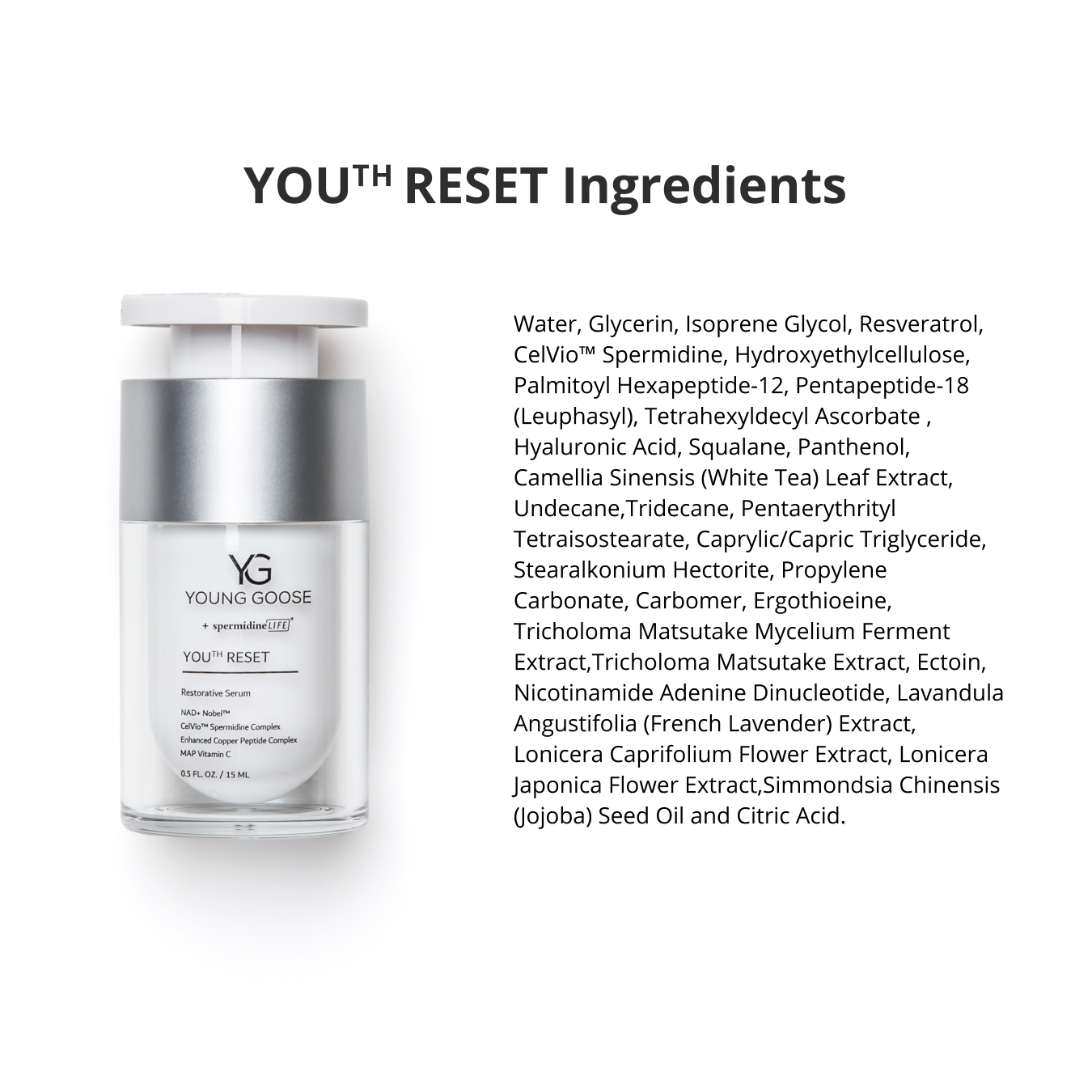 YOUTH RESET: Water, Glycerin, Isoprene Glycol, Resveratrol, CelVio™️ Spermidine, Hydroxyethylcellulose, Palmitoyl Hexapeptide-12, Pentapeptide-18 (Leuphasyl), Tetrahexyldecyl Ascorbate , Hyaluronic Acid, Squalane, Panthenol, Camellia Sinensis (White Tea) Leaf Extract, Undecane,Tridecane, Pentaerythrityl Tetraisostearate, Caprylic/Capric Triglyceride, Stearalkonium Hectorite, Propylene Carbonate, Carbomer, Ergothioeine, Tricholoma Matsutake Mycelium Ferment Extract,Tricholoma Matsutake Extract, Ectoin, Nicotinamide Adenine Dinucleotide, Lavandula Angustifolia (French Lavender) Extract, Lonicera Caprifolium Flower Extract, Lonicera Japonica Flower Extract,Simmondsia Chinensis (Jojoba) Seed Oil and Citric Acid.